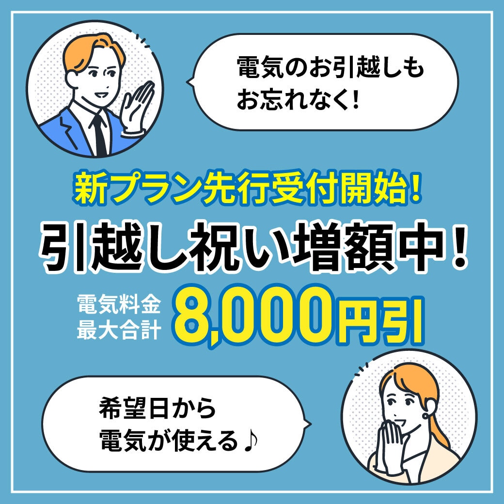 スマ電ご契約者さまがお引越し先でもスマ電を継続してご契約いただくと、引越し祝いとしてお引越し先の電気料金の値引きをプレゼント!お引越しが決まったら、マイページから電気のご利用場所の変更をお申込みいただくか、サービスセンター(0120-905-973)へお電話でご連絡ください。ご実家がスマ電をご契約で、新たに一人暮らしを始める方も対象になります。