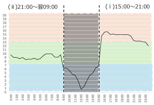 13円を上回った場合、13円との差分に時間帯別の区分係数および基準価格を乗じてプラス調整します。7円を下回った場合、7円との差分に時間帯別の区分係数および基準価格を乗じてマイナス調整します。7円以上、13円以下の場合、調整は行いません。